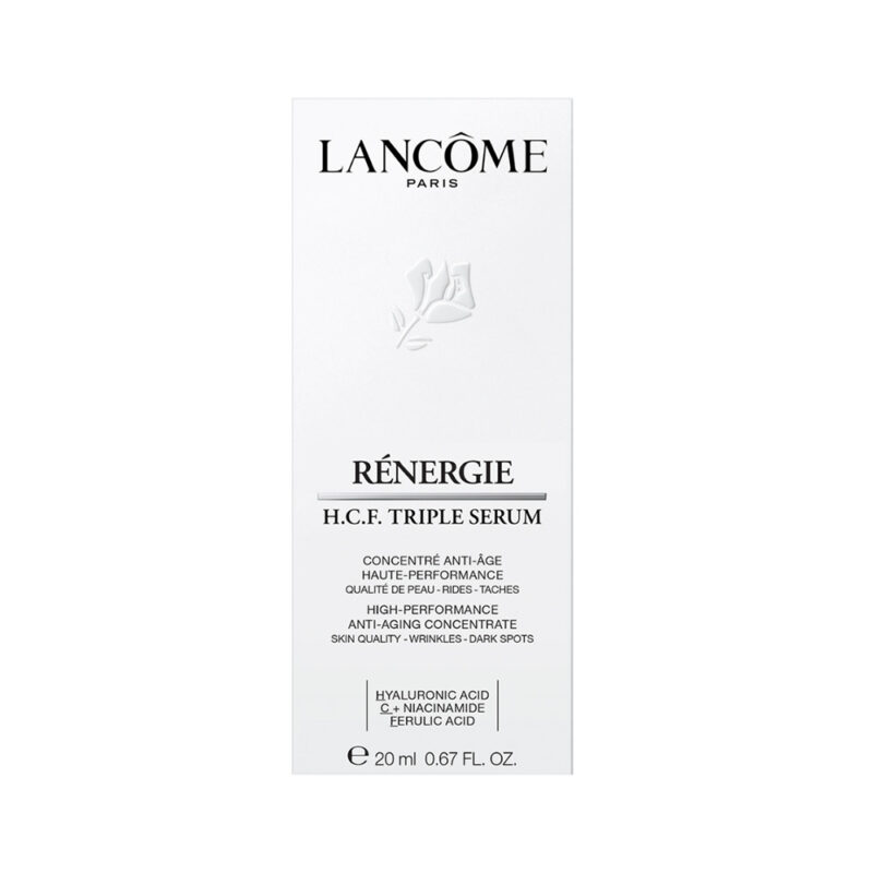 Lancôme z novim Rénergie H.C.F. trojnim serumom uvaja novo dobo visoko učinkovitih izdelkov za nego kože, ki pomembno prispevajo k volumnu kože in negujejo proti gubam in temnim madežem. Revolucionarna formula, ki v enem samem trojnem odmerku združuje tri aktivne sestavine, znane po svojih komplementarnih in sočasnih učinkih na znake staranja kože, ki so do sedaj veljale za nezdružljive: hialuronsko kislino, vitamin C + niacinamid in ferulinsko kislino.