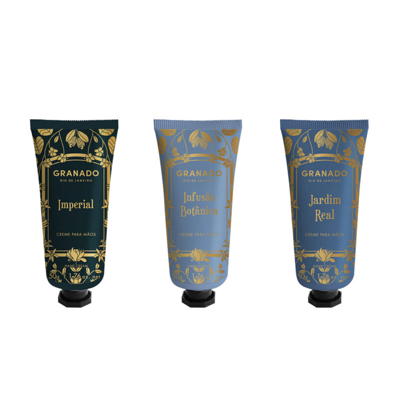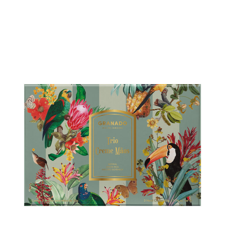 Komplet vključuje tri vlažilne kreme z dišavami Infusão Botânica, Imperial in Jardim Real.
